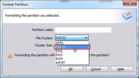 3. Then, select FAT32 (or other file system you need) and click “OK” to start format.